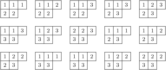 For example, if \(\lambda = (3,2)\) and \(r = 2\), then we find 15 tableaux with shape \(\lambda\) and entries in \(\{1,2,3\}\):