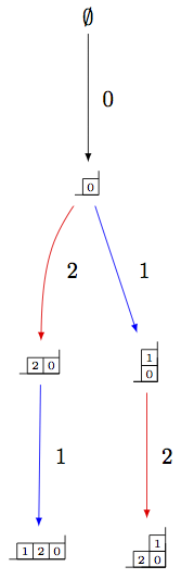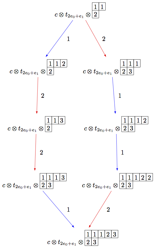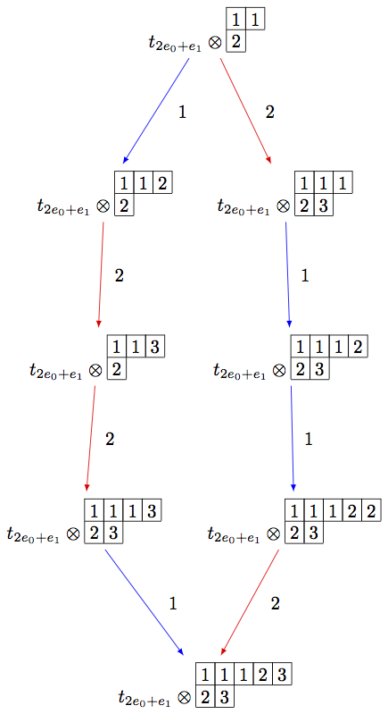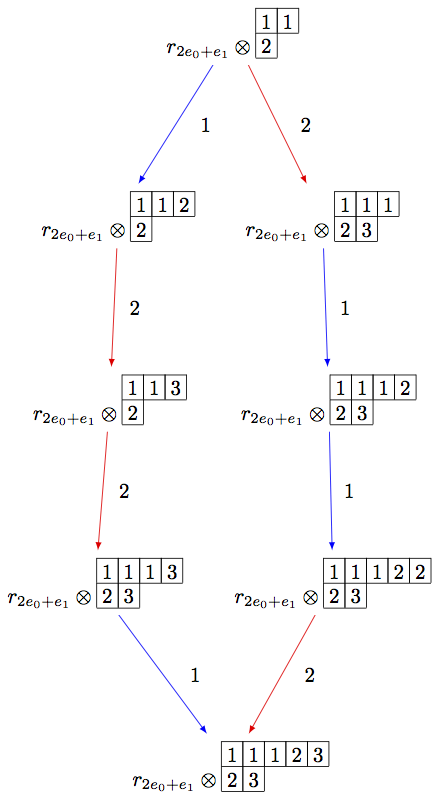B = crystals.infinity.Tableaux(['A',2]) b = B.highest_weight_vector() R = crystals.elementary.R(['A',2], B.Lambda()[1] + B.Lambda()[2]) r = R[0] TP2 = crystals.TensorProduct(R,B) t2 = TP2(r,b) STP2 = TP2.subcrystal(generators=[t2]) GTP2 = TP2.digraph(subset=STP2) view(GTP2, tightpage=True) # optional - dot2tex graphviz, not tested (opens external window)