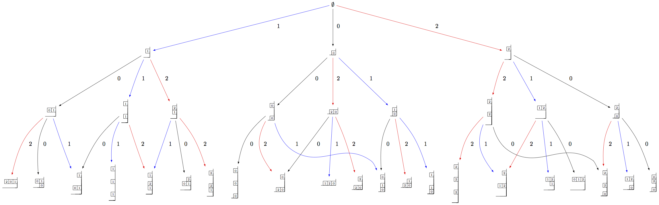 B = crystals.infinity.Tableaux(['A',2]) b = B.highest_weight_vector() T = crystals.elementary.T(['A',2], B.Lambda()[1] + B.Lambda()[2]) t = T[0] C = crystals.elementary.Component(['A',2]) c = C[0] TP = crystals.TensorProduct(C,T,B) t0 = TP(c,t,b) STP = TP.subcrystal(generators=[t0]) GTP = TP.digraph(subset=STP) view(GTP, tightpage=True) # optional - dot2tex graphviz, not tested (opens external window)