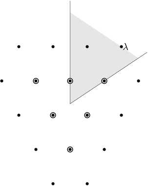 In this example, \(G = \hbox{SL}(3,\CC)\). We have drawn the weights of an irreducible representation with highest weight \(\lambda\). The shaded region is \(\mathcal{C}^+\). \(\lambda\) is a dominant weight, and the labeled vertices are the weights with positive multiplicity in \(V(\lambda)\). The weights weights on the outside have \(m(\mu) = 1\), while the six interior weights (with double circles) have \(m(\mu) = 2\).